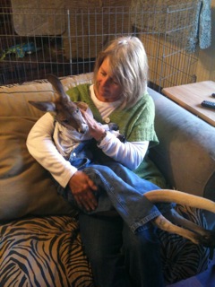 When we arrived and walked into their main room we all stood in awe with huge smiles as there in front of us was one of the volunteers, Carol sitting in a large upholstered chair with a six month old kangaroo, named Erwin snuggled up under her arm. Erwin was dressed in a pair of coveralls with a blue and white striped shirt. The clothing was tailored to fit him perfectly down to the hole in the back to accommodate his large tail and the tiny cuffs for his wrists. We discovered that Erwin had fractured his neck when he ran head long into a fence, and was left with some brain damage. Through Carol’s constant care and dedication, Erwin’s fracture had healed nicely and he could now hop a step or two on his own.