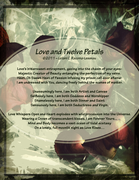 Love and Twelve Petals by Leilani C. Racoma-Lessnau by OM Times Editor Tags artist beauty bittersweet creator dancing ecxtasy entrapment eyes forever Goddess heat Leilani C. Racoma-Lessnau lonely Love majestic moon perfection prison saint seductress selfless shameless sinner sweet transcendent universe whisper worship 0 Comments