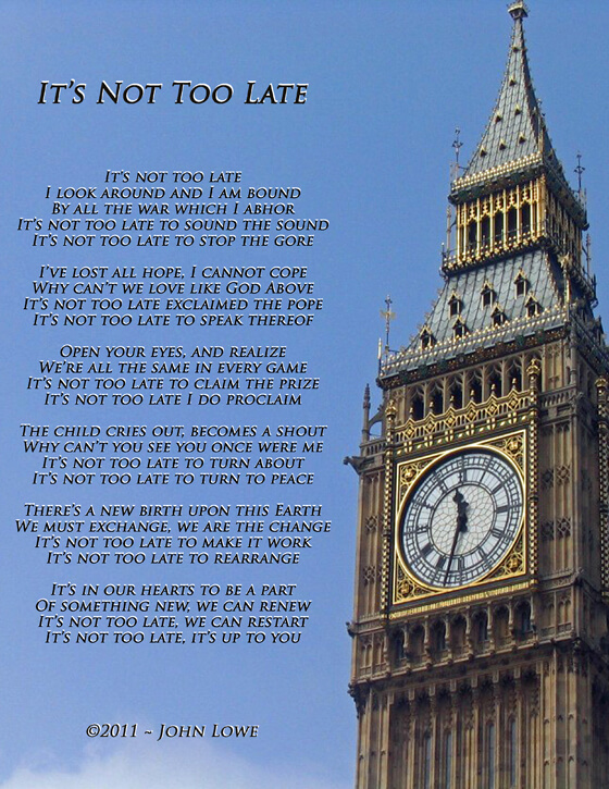 It’s Not Too Late by John Lowe by OM Times Editor Tags bound change child God heart hope John Lowe late new new birth peace prize restart sound war 0 Comments