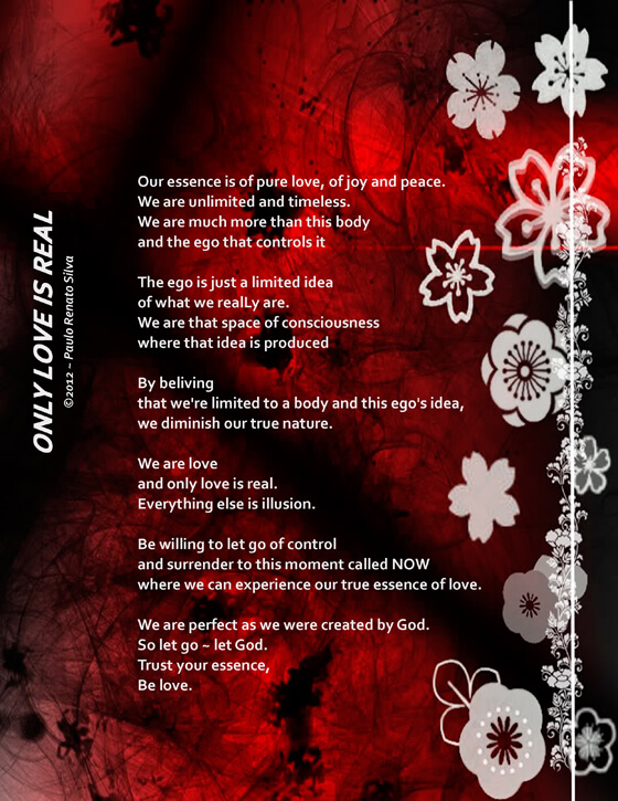 Only Love is Real by Paulo Renato Silva by OM Times Editor Tags believe body consciousness control ego ideas essence God illusion joy Love nature NOW Paulo Renato Silva peace perfect real surrender timeless trust unlimited 0 Comments