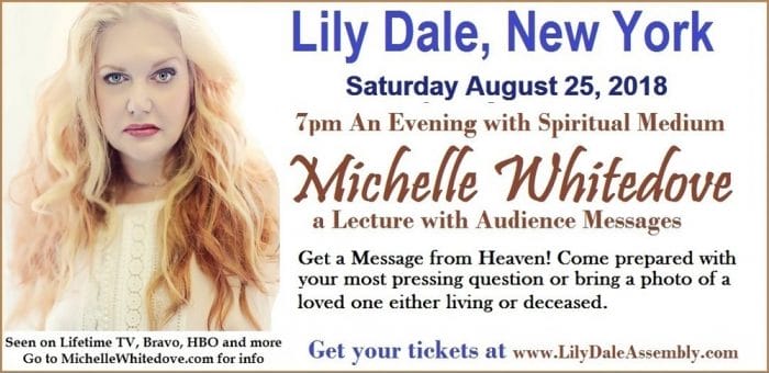 Be sure to attend Michelle’s SEASON HIGHLIGHT EVENT Sat Aug 25th An Evening with Whitedove in Lily Dale. A Lecture with Audience Messages.  Click here for tickets:  http://bit.ly/LilyDale-2018