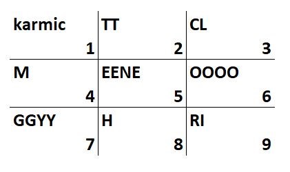 Next, we chart which letters fall into which numbers as the tic-tac-toe board below illustrates.
