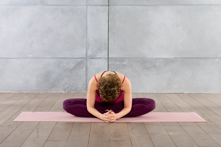 1. Sit on the mat, place the soles of your feet together, and pull the feet towards the pelvis. Let the knees drop gently outwards, or support the outsides of the legs with two blocks if this stretch is too intense for you. You can also sit on a blanket or a cushion. Relax the back, let your upper body sink forward passively, and place your arms where it is comfortable for you.
