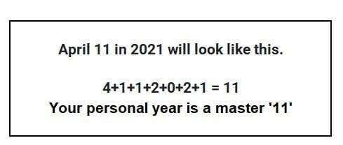 Personal Year: First, discover your personal year by adding the sum of your birth month and your birthday to the current year. To allow the possibility of a master number (when two numbers are the same),