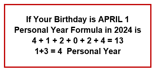 Example: If you were born April 1, 2024, your personal year would be “4”